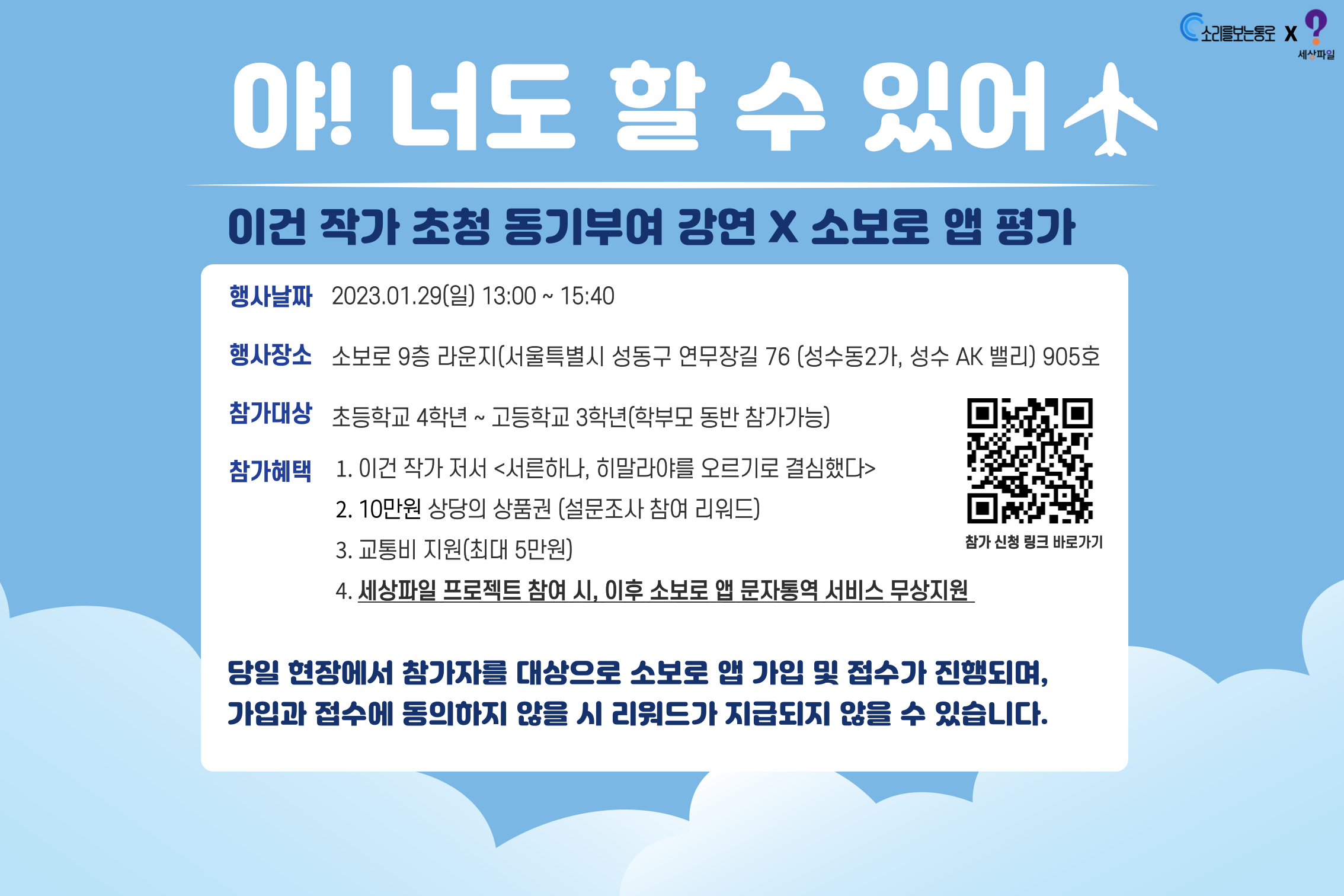 *당일 현장에서 소보로 앱 가입과 접수가 이루어질 예정입니다. 가입과 접수에 동의하지 않을 시 리워드가 지급되지 않는 점 참고 부탁 드립니다.